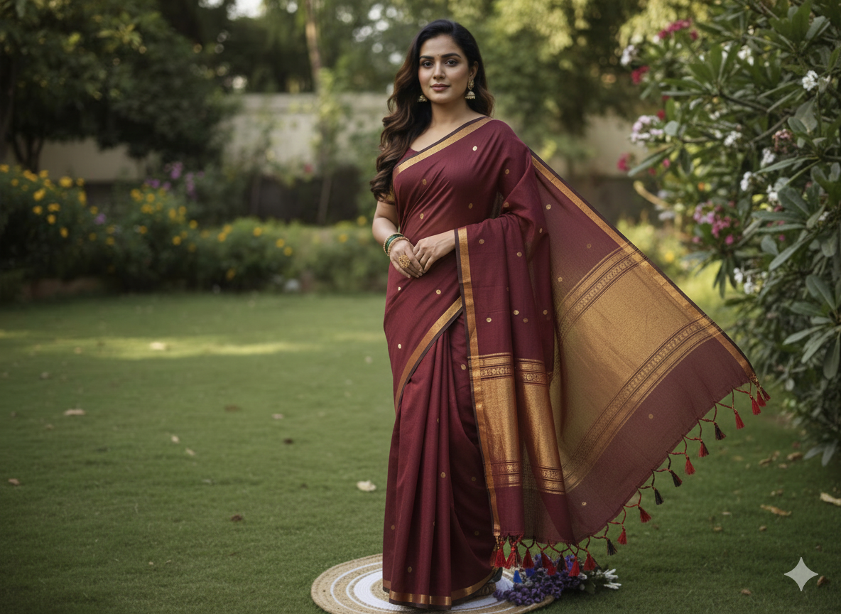 Mul Cotton saree, Gini Work, tassels, Without Blouse piece