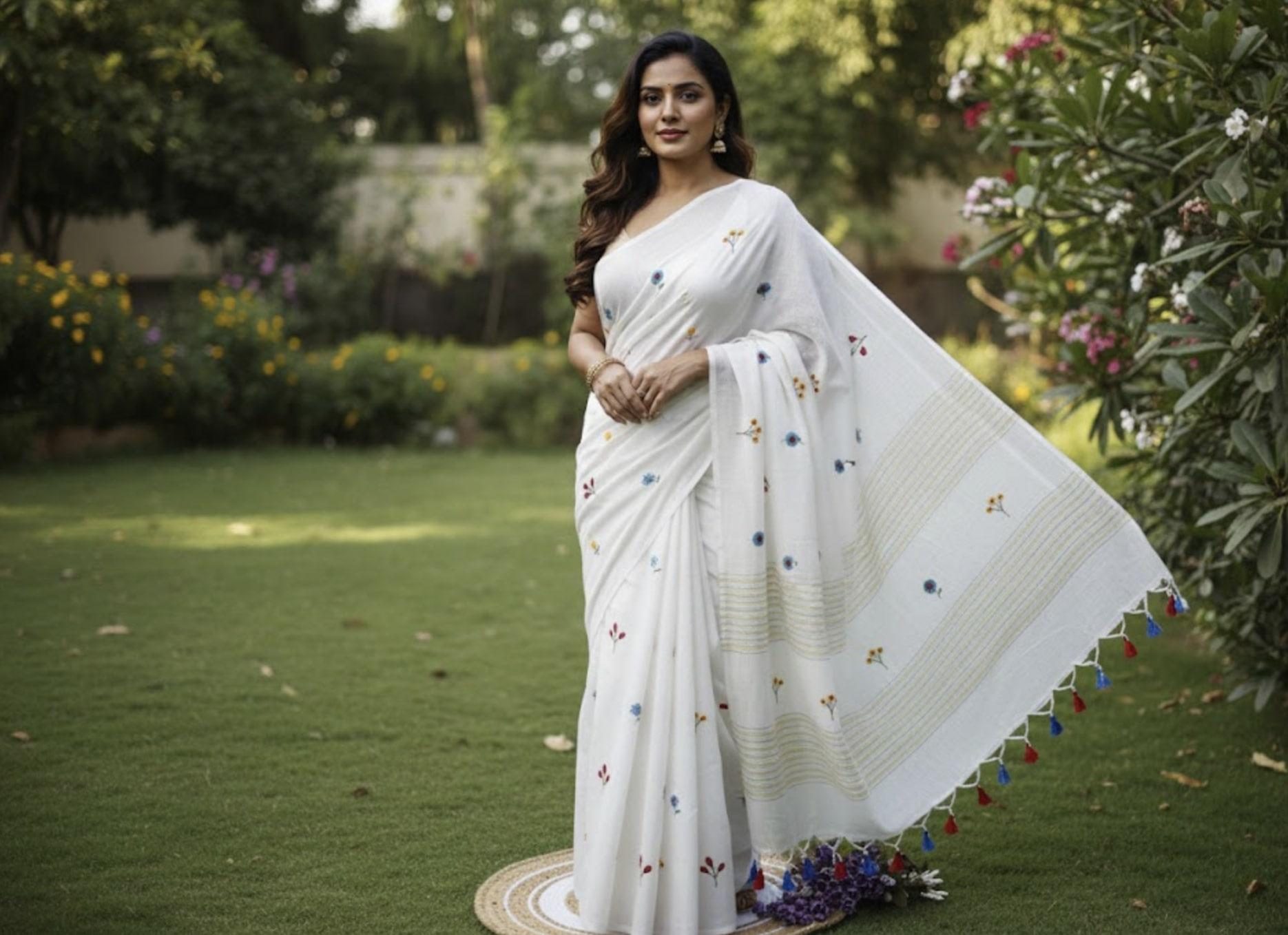 Mul Cotton saree, Flower embroidery, tassels, Without Blouse piece