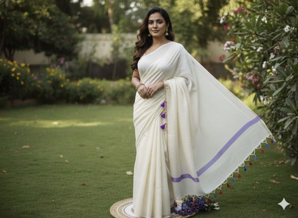 Mul Cotton saree,Zari border, tassels, Without Blouse piece